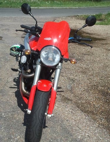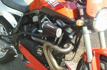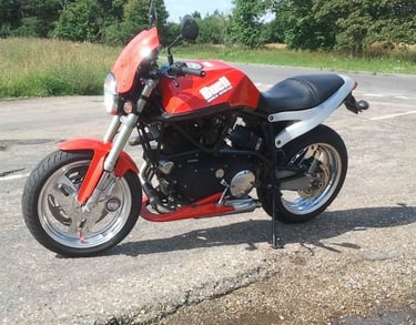Harley Davidson 1200cc Twin engine, bumped to 100bhp and stuck in a sportsbike chassis.