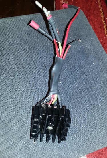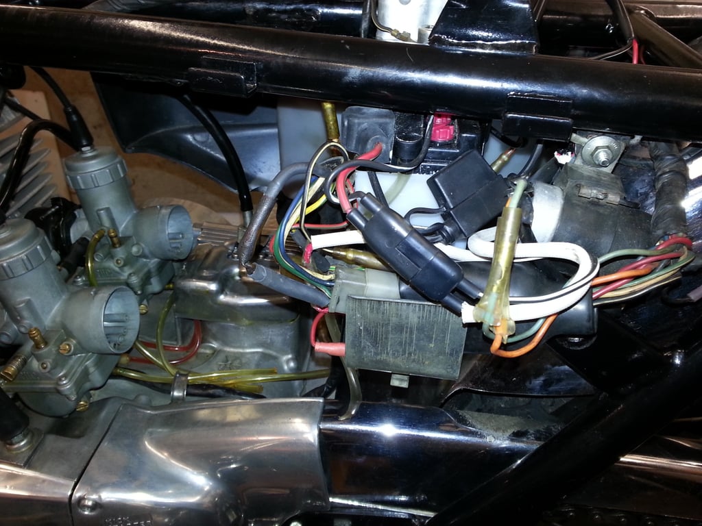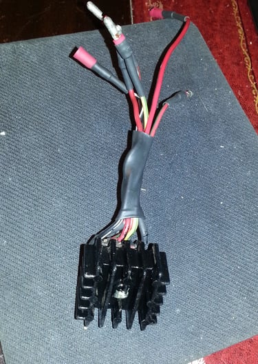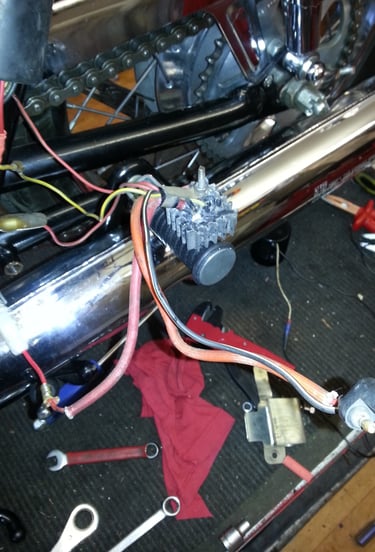 On the electrical side the bike wasn't starting properly and wasn't charging. I found the Rectifier unit wasn't working and finding a decent or NOS replacement wasn't easy and was fairly expensive. Luckily I found one at the Stafford show which needed a bit of wiring work but worked fine. A few other wires needed work and anew fuse box fitted.