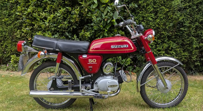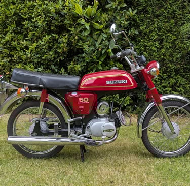 My parents could see I was interested and unknown to me at the time had apparently been planning for me to get a moped to help with travel when I went to college in the September. In April of 77 I went off with my farther to Eddy Grimstead Motorcycles in East Ham to have a look round. Fairly large dealership for the time and had most of the main Japanese manufacture’s options to look over and sit on. Amongst the various models they had both the Blue and the Red AP50 options. I’d briefly ridden a Honda SS50 and also the Suzuki AP50 on some open fields and I had really liked the Suzuki, so settled on a nice shiny Red one for the princely sum of £310, which included a Rack, Topbox, Crashbars, Road Tax and even Insurance for 12 months to start when I turned 16 in June.