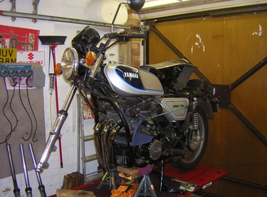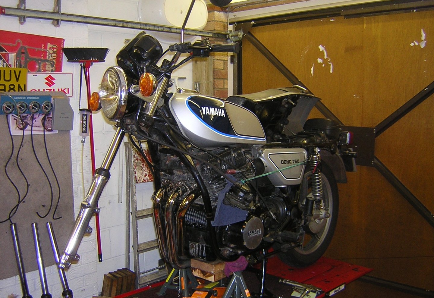 Bike on the bench, forks off for new seals and oil. New tyres fitted, carbs checked over, new oil and filter, new plugs and a bunch of other minor electrical bits and bobs done.