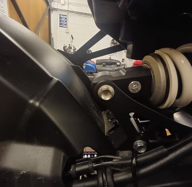 I decided to try the K-Factory links to lower the rear a bit. I could then adjust the rear shock they way I wanted with the right SAG etc. and when the original Cafe seat was refitted it all felt so much better for the 150 miles + day trips. I did also have to get a different sidestand, also K-Factory.